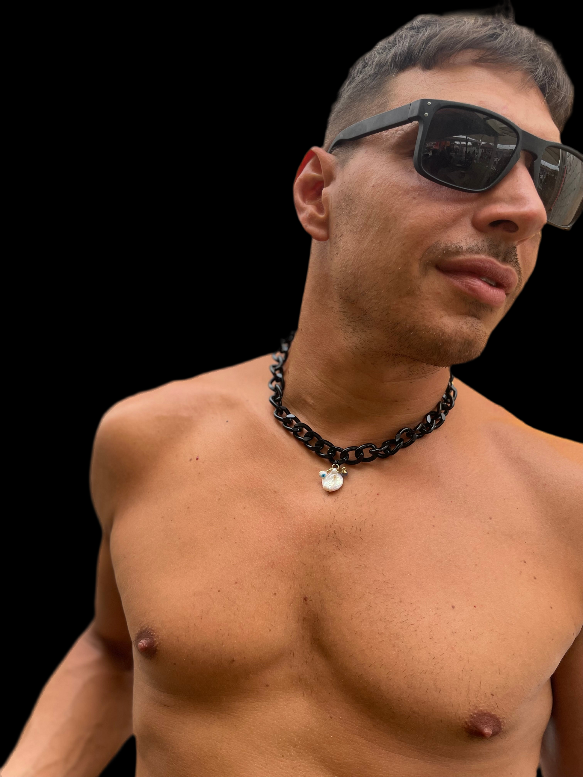 Acciaio inox nero virtuoso, perla barocca, vetro levigato dal mare e occhio porta fortuna.